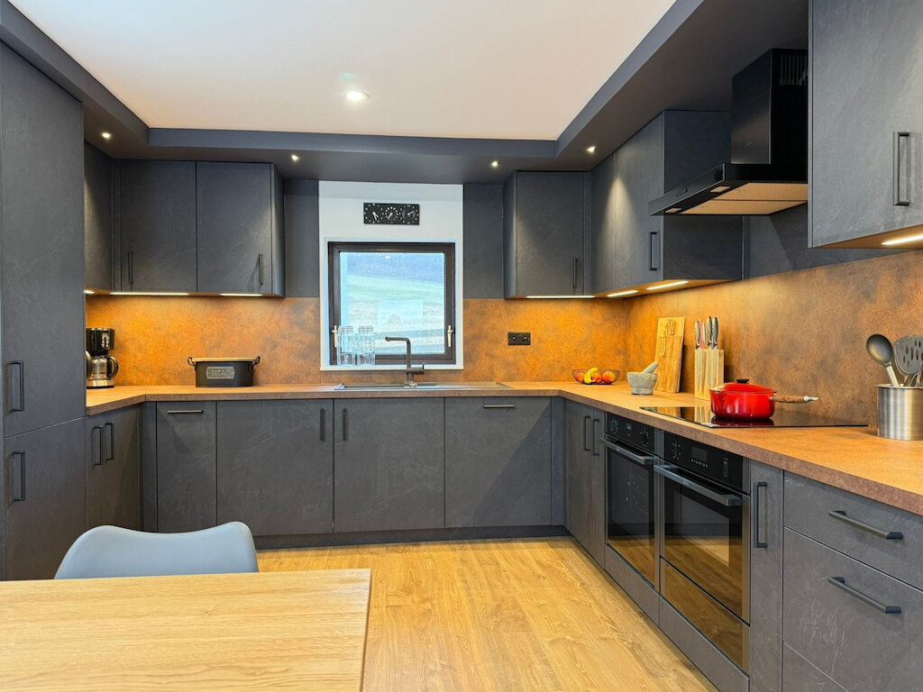 The final design features Nobilia StoneArt in Grey Slate reproduction, creating a bold, textured look inspired by natural stone. This finish was used across both the cabinetry and wall panelling, delivering a cohesive and architectural feel throughout the space.