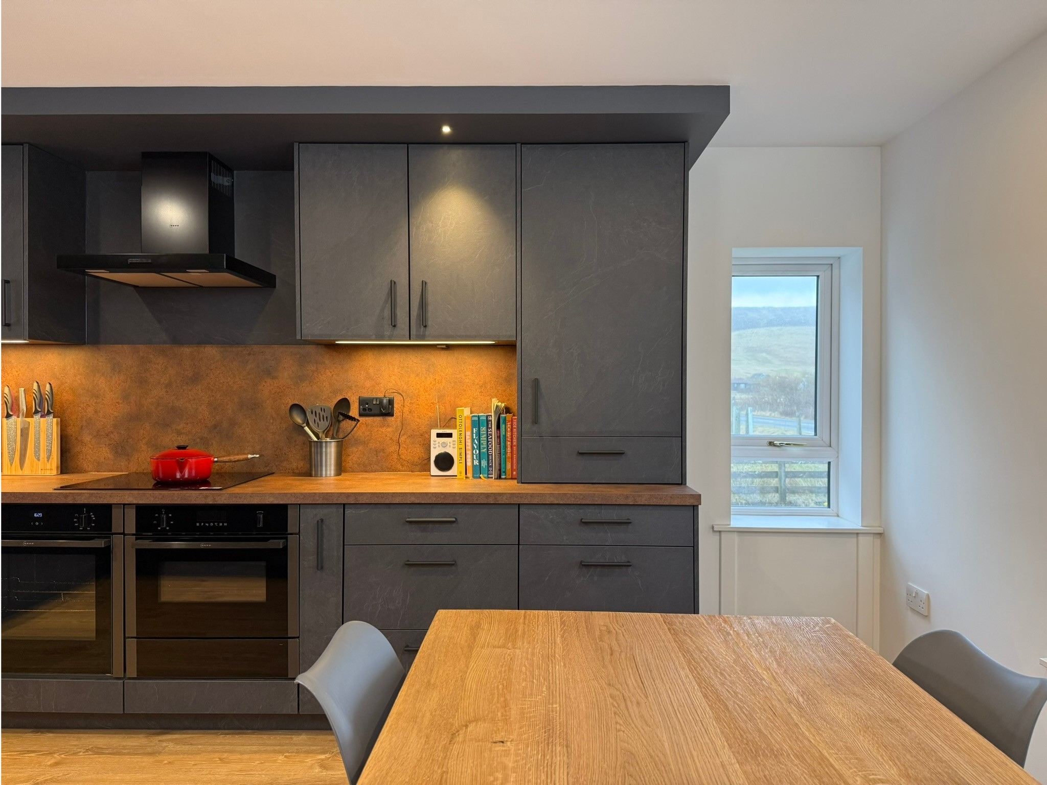 The overall style blends industrial and modern influences, with a strong focus on raw materials and layered textures. To enhance this look, the client selected corten steel worktops and splashbacks from Nolte, adding warmth and depth while reinforcing the industrial aesthetic.
